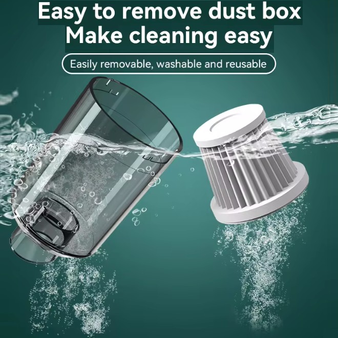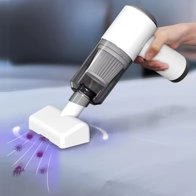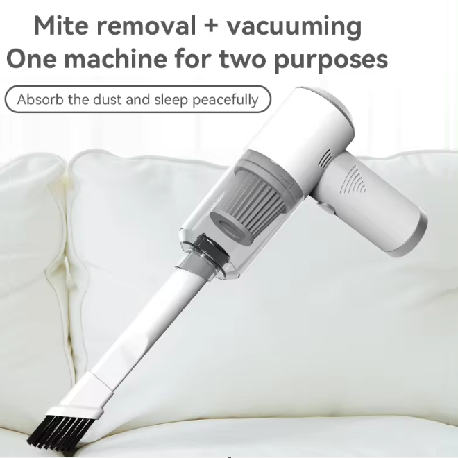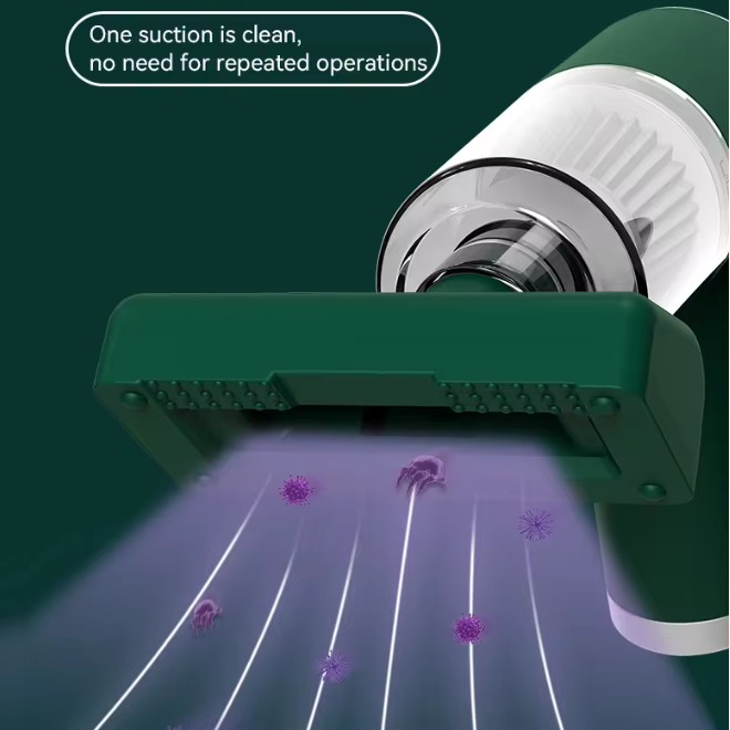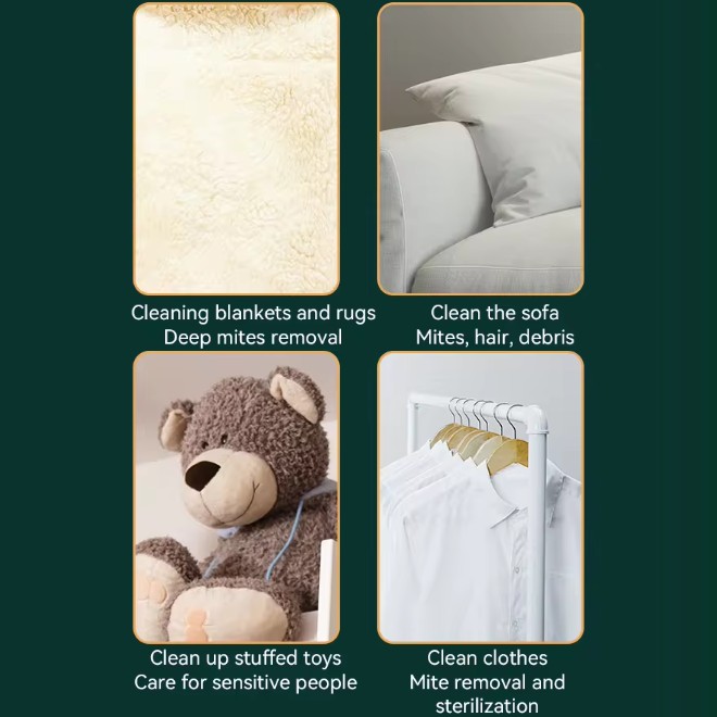 Feature: Mite removal + vacuuming, Strong suction, Easily removable, washable and reusable, One-button start.